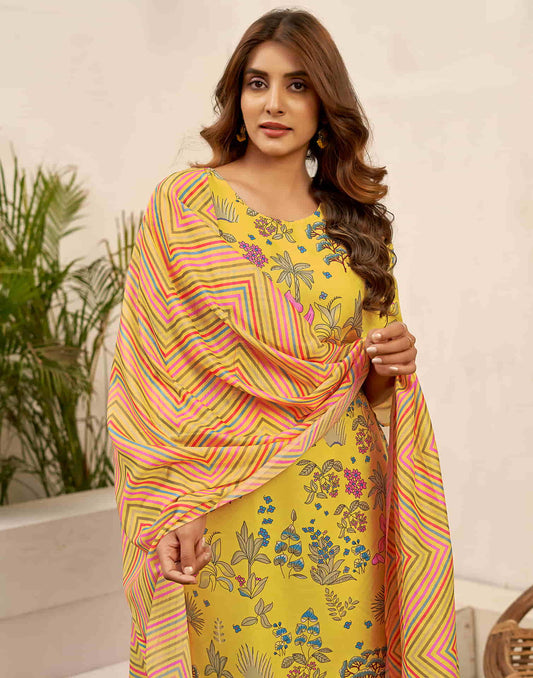Yellow Printed Rayon Straight Kurta With Pant And Dupatta