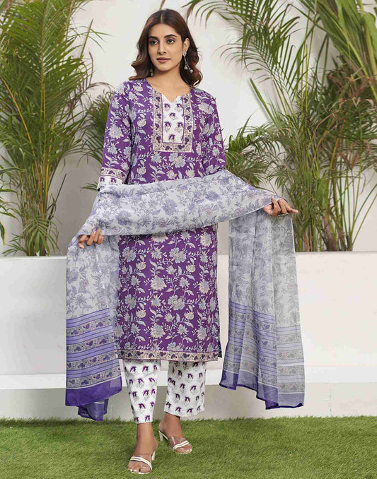 Purple Printed Rayon Straight Kurta Set With Dupatta