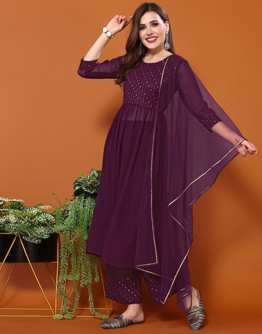 Wine Georgette Embroidery Flared Kurta Kurti With Pant And Dupatta