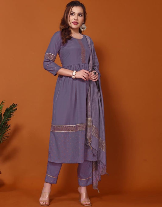 Purple Printed Flared Kurta Kurti With Pant And Dupatta
