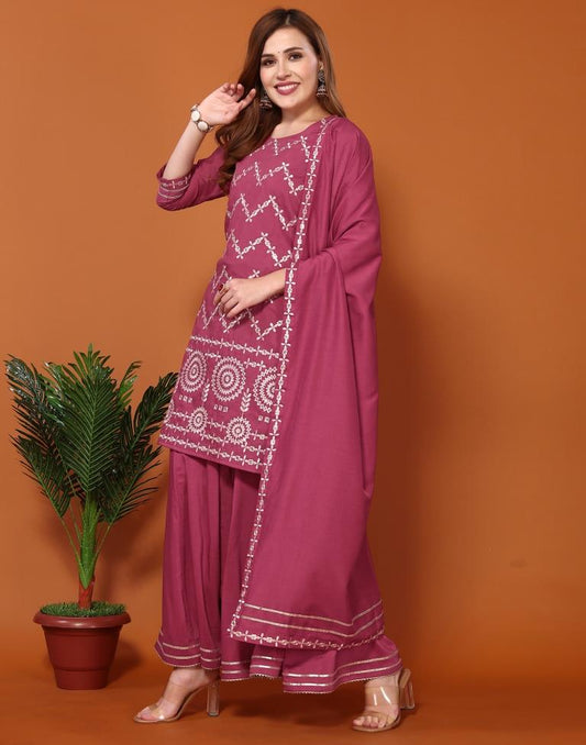 Purple Chinnon Embroidery Sharara Suit Kurti With Pant And Dupatta