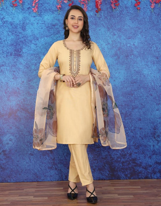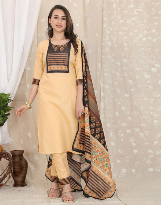 Beige Cotton Embroidery Straight Kurta With Pant And Dupatta