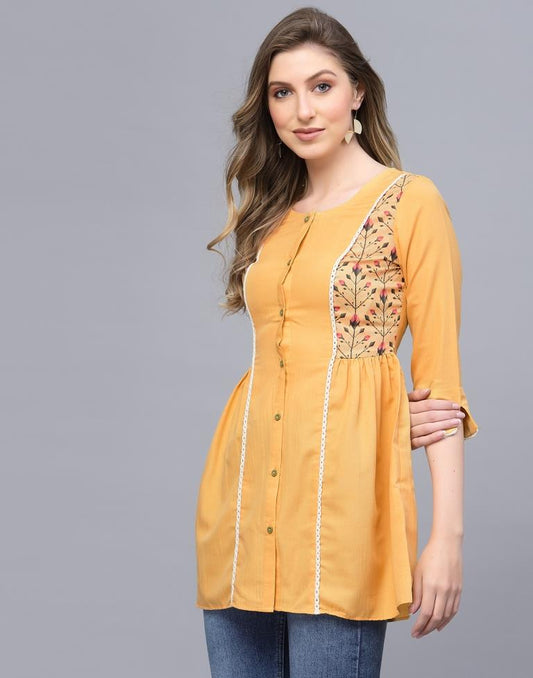 Charismatic Mustard Yellow Coloured Embroidered Patch Rayon Kurti