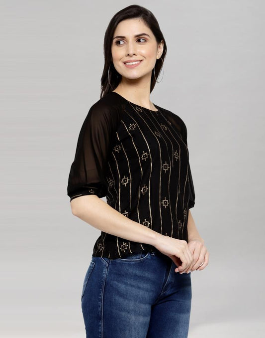 Regular price Rs. 399.00Regular priceUnit price / perRs. 0.00Sale price Rs. 399.00Black Coloured Rayon- Georgette Foil Printed Top