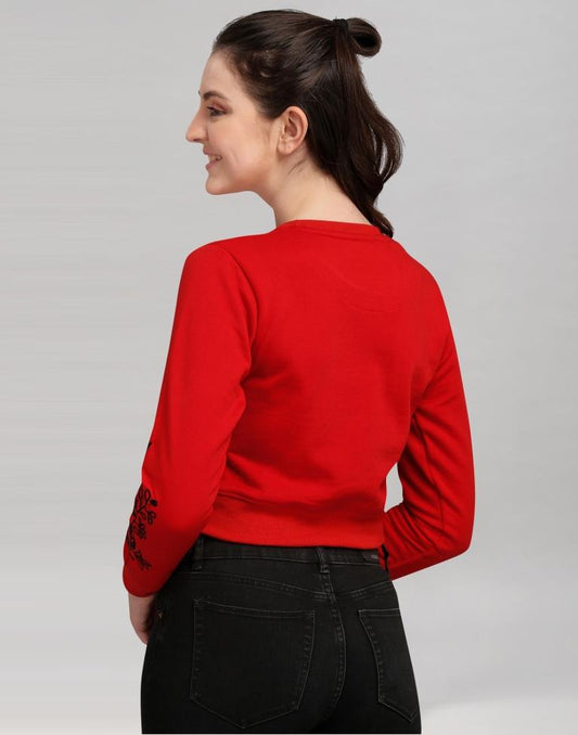 Red Coloured Cotton Fleece Blend Embroidered Sweatshirt