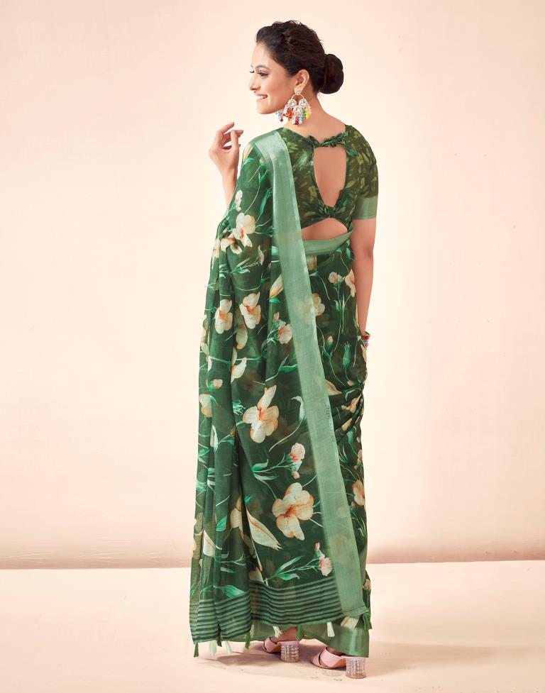 Dark Green Linen Printed Saree