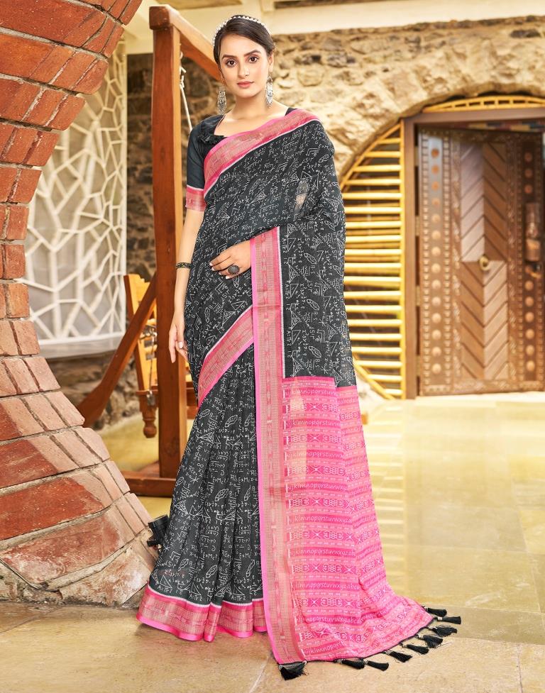 Dark Grey & Pink Linen Printed Saree