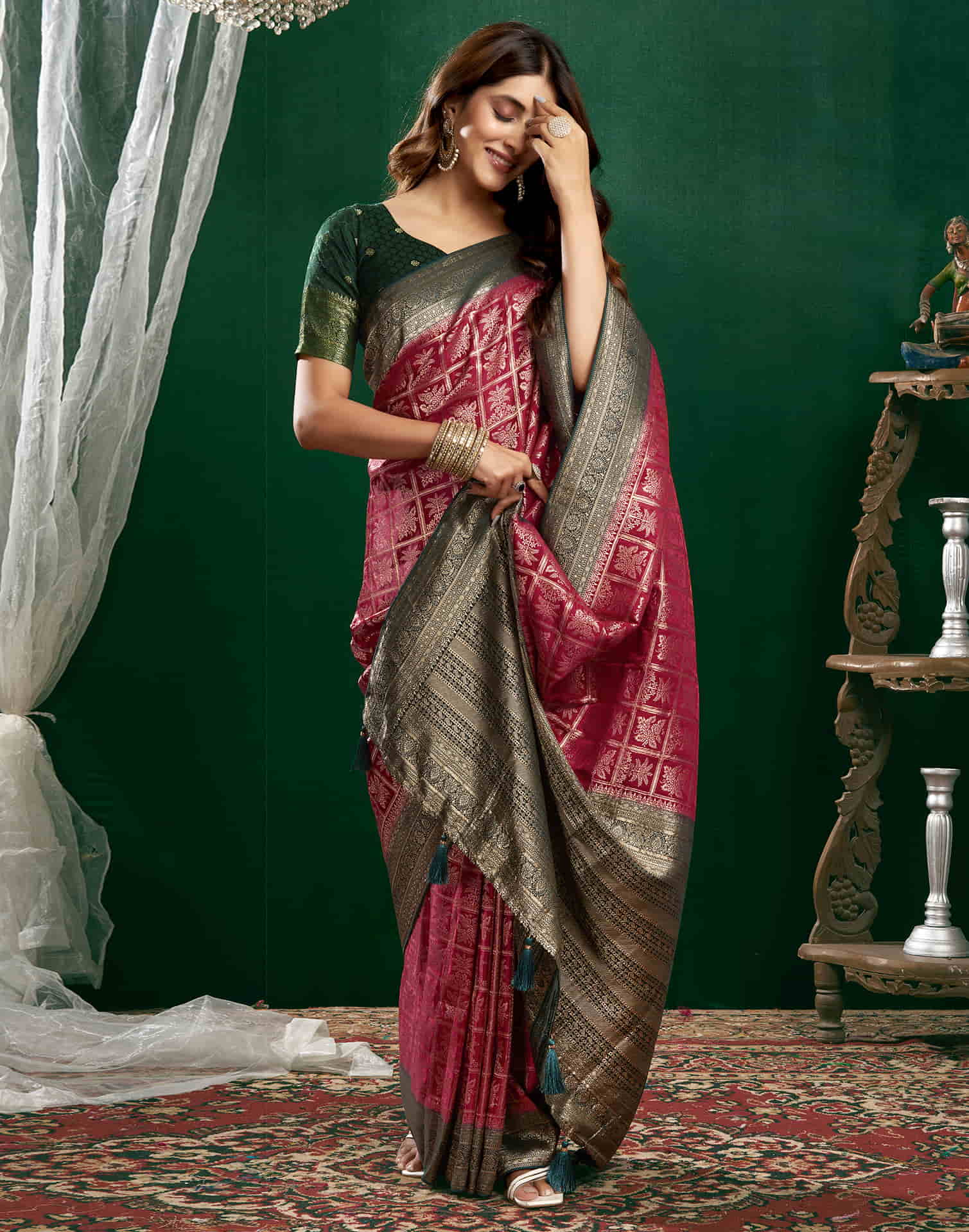Deep Pink Satin Woven Banarasi Saree