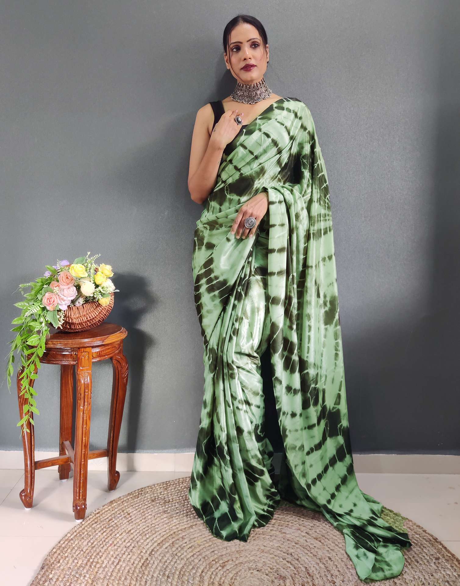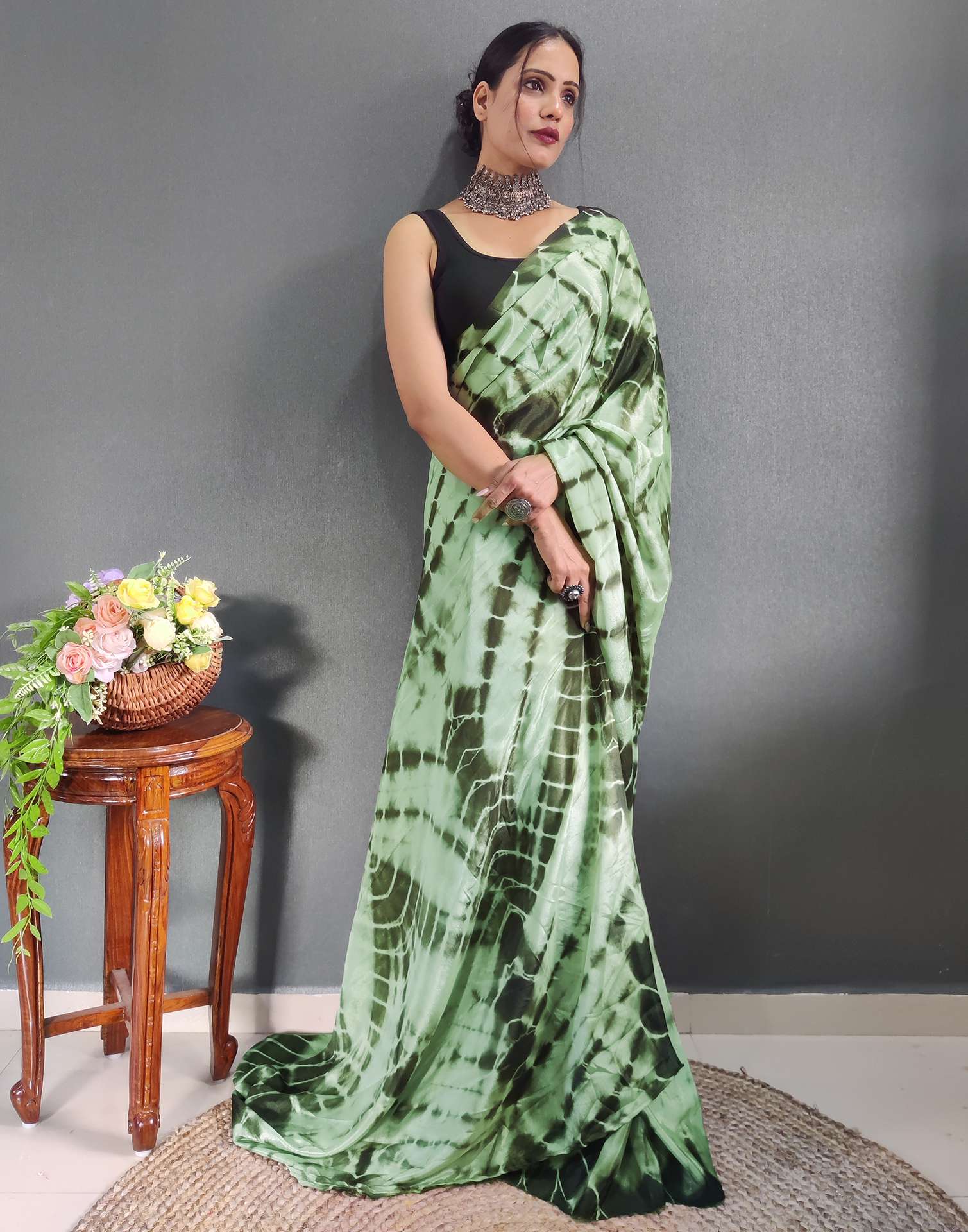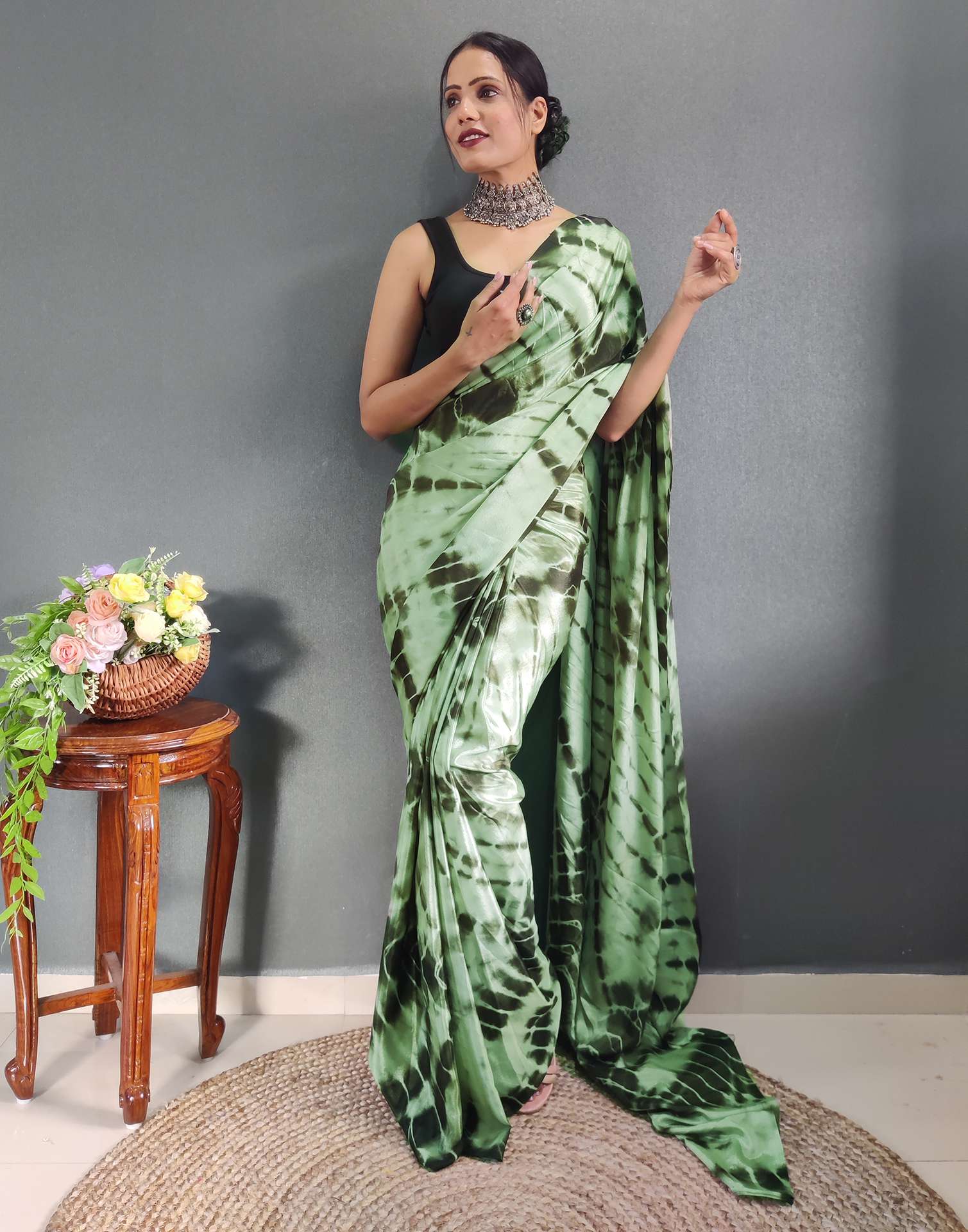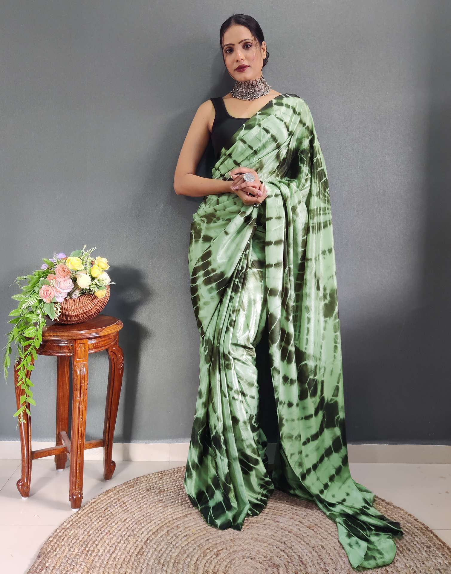 Ready to Wear Dull Green Printed Silk Saree