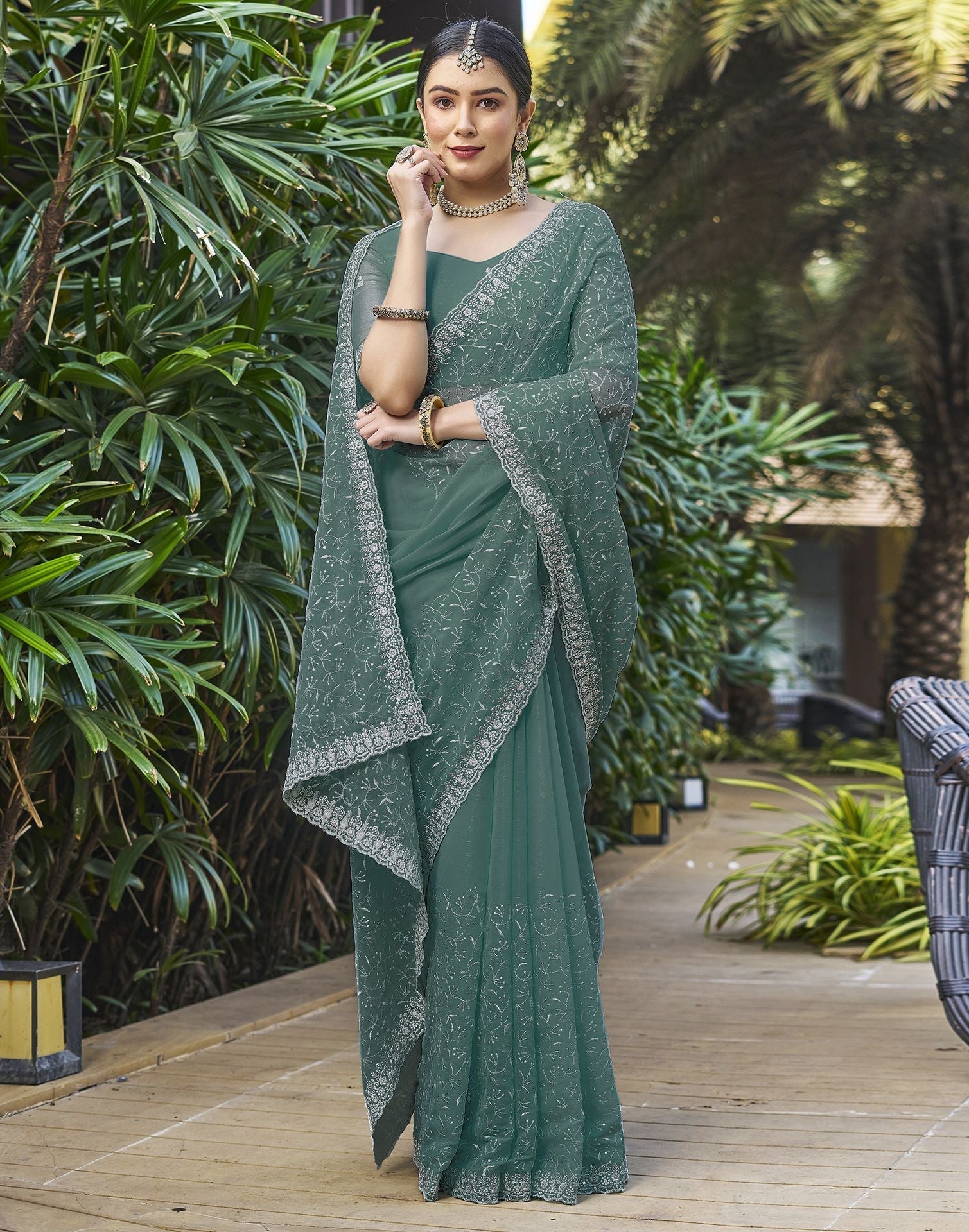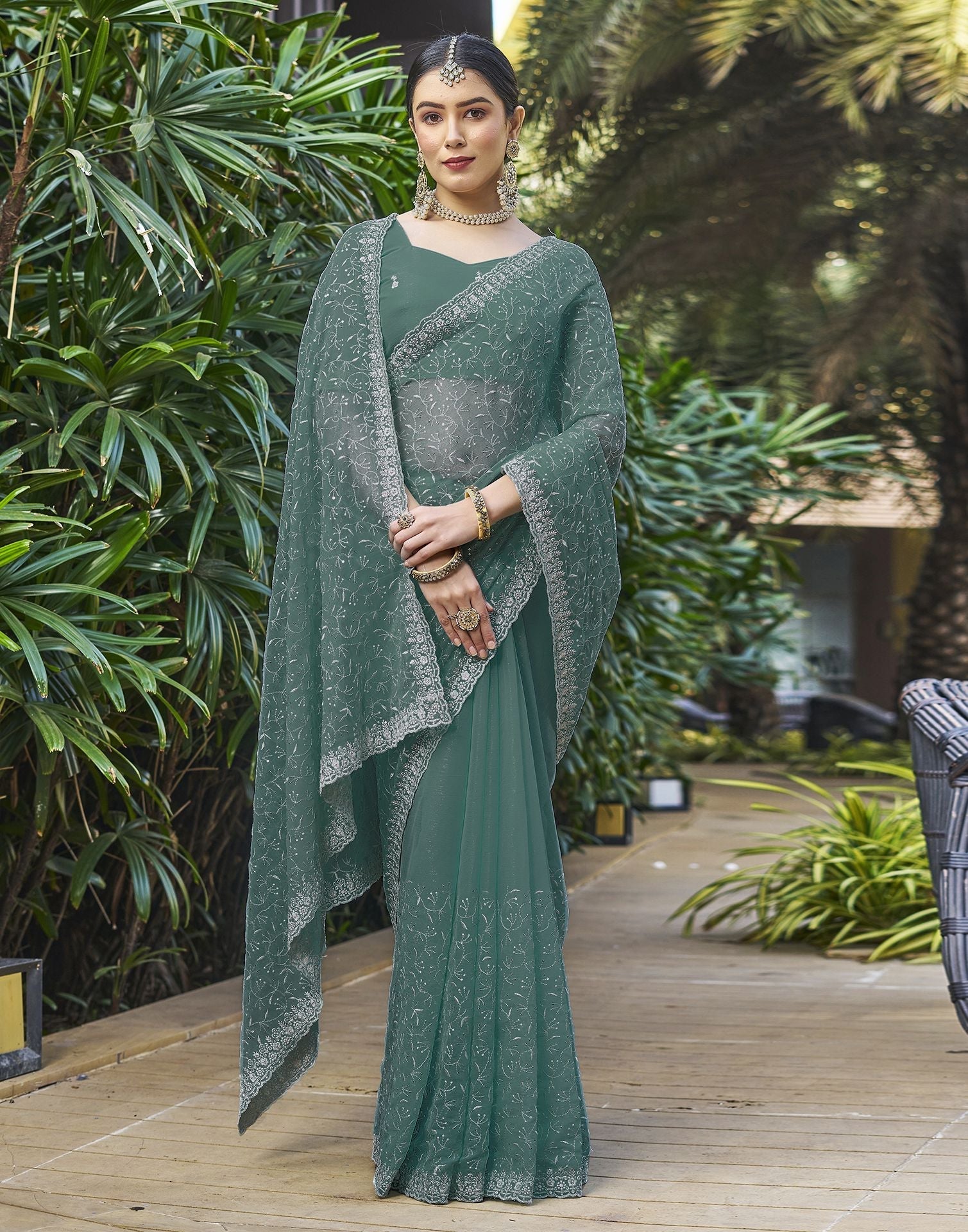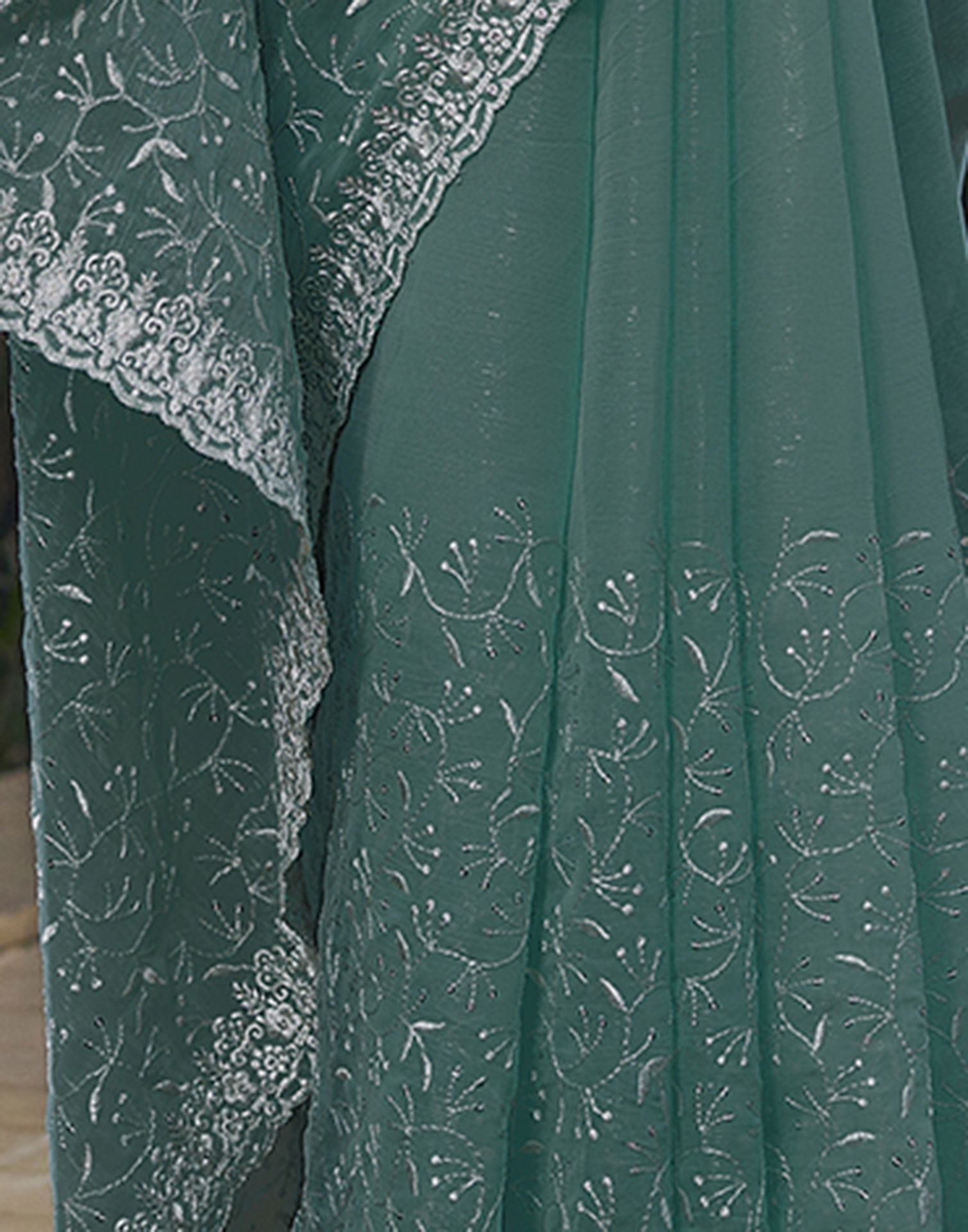 Dull Teal Plain Chiffon Saree