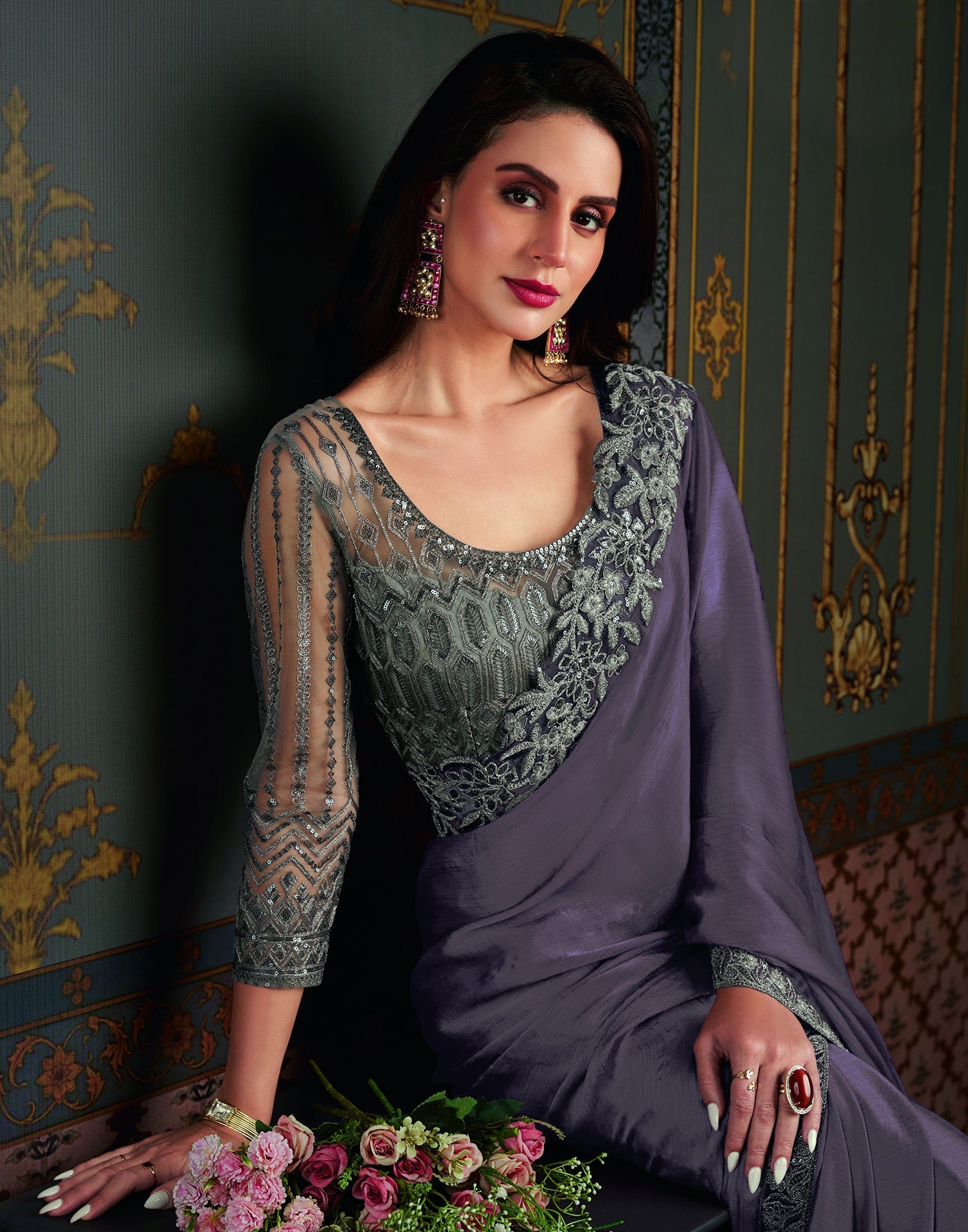 Grey Satin Plain Saree