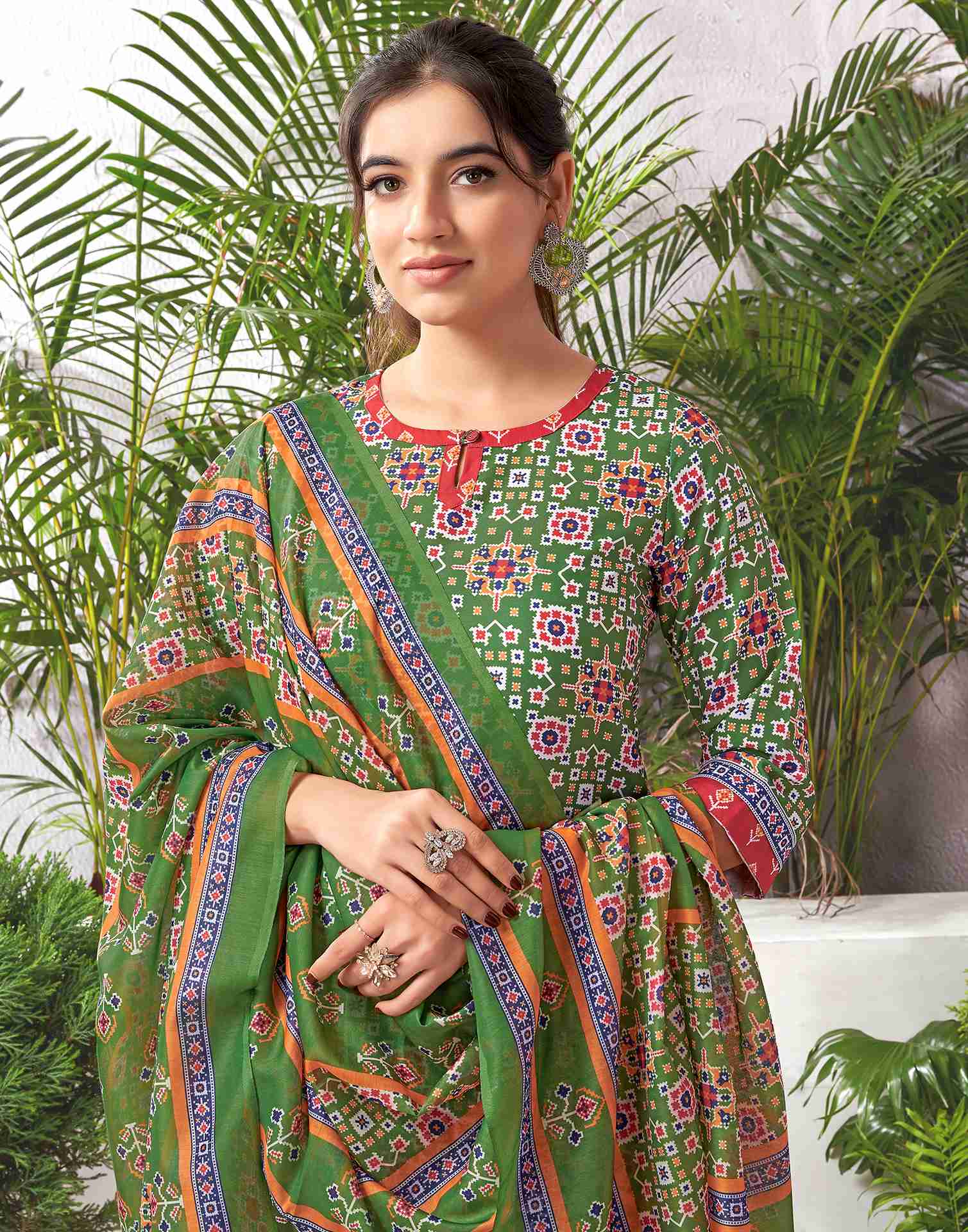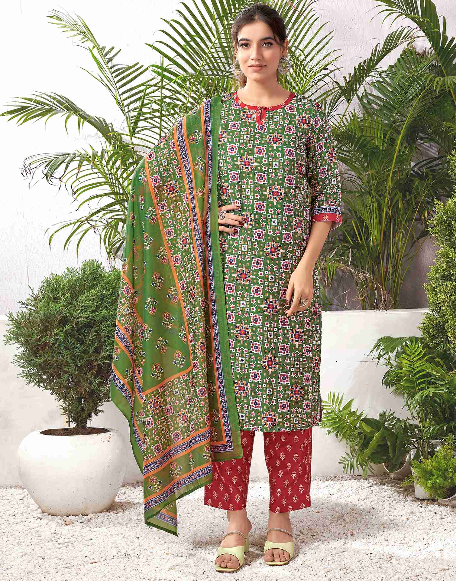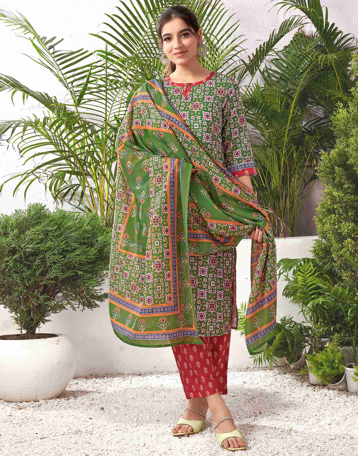 Green Rayon Geometric Straight Kurta Set With Dupatta