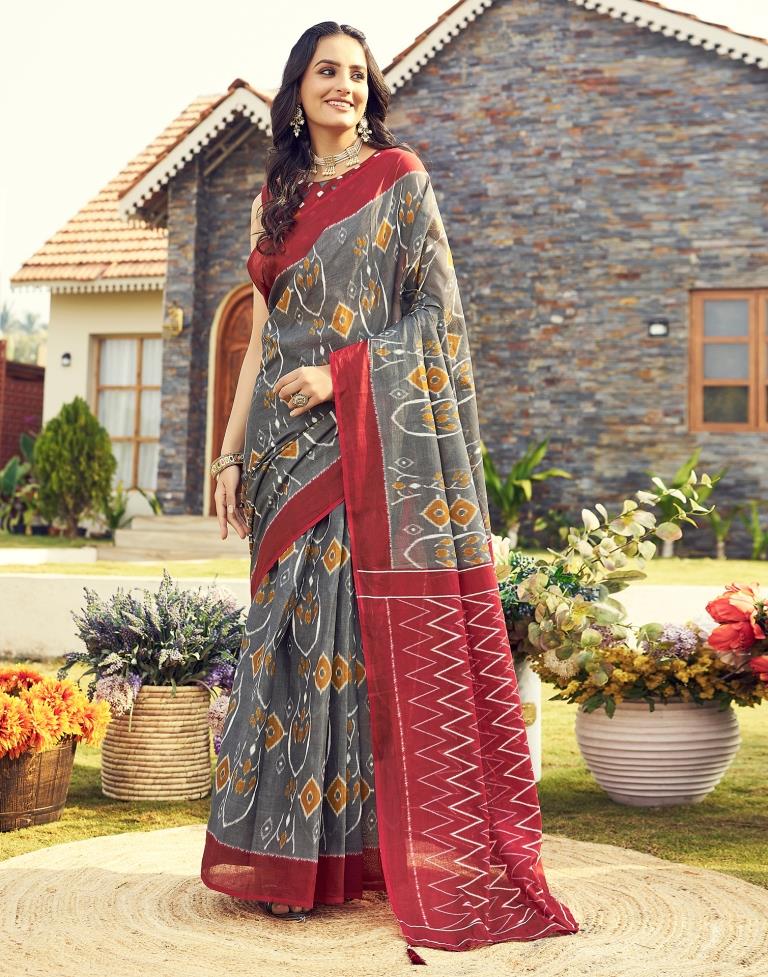 Ready to Wear Grey & Multicoloured Cotton Printed Saree