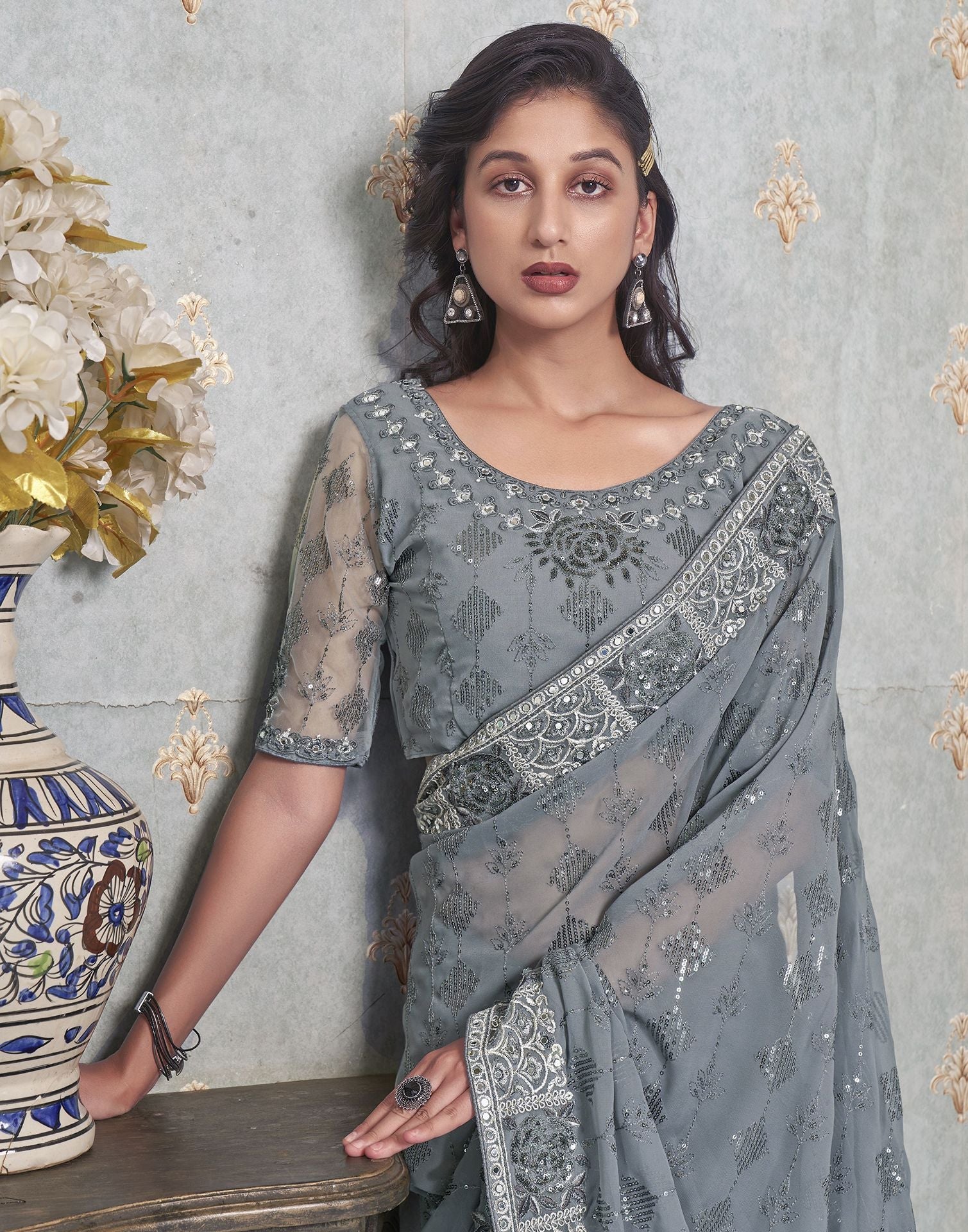 Grey Plain Georgette Saree