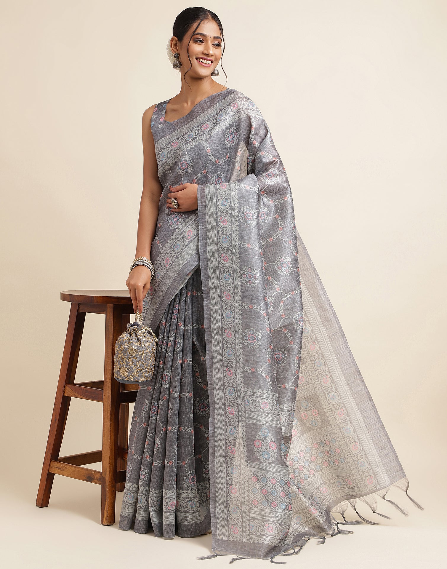 Grey Silk Digital Printed Saree