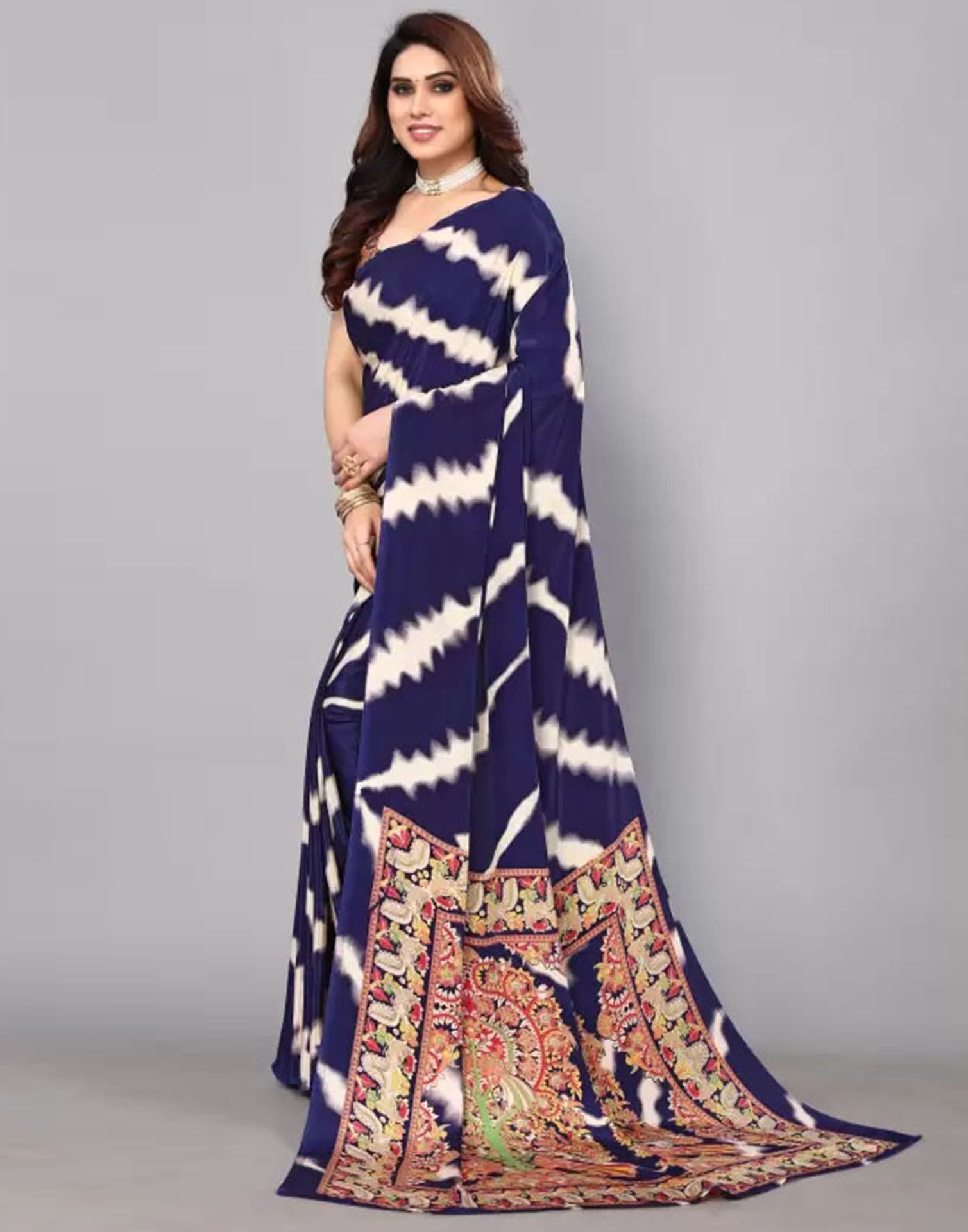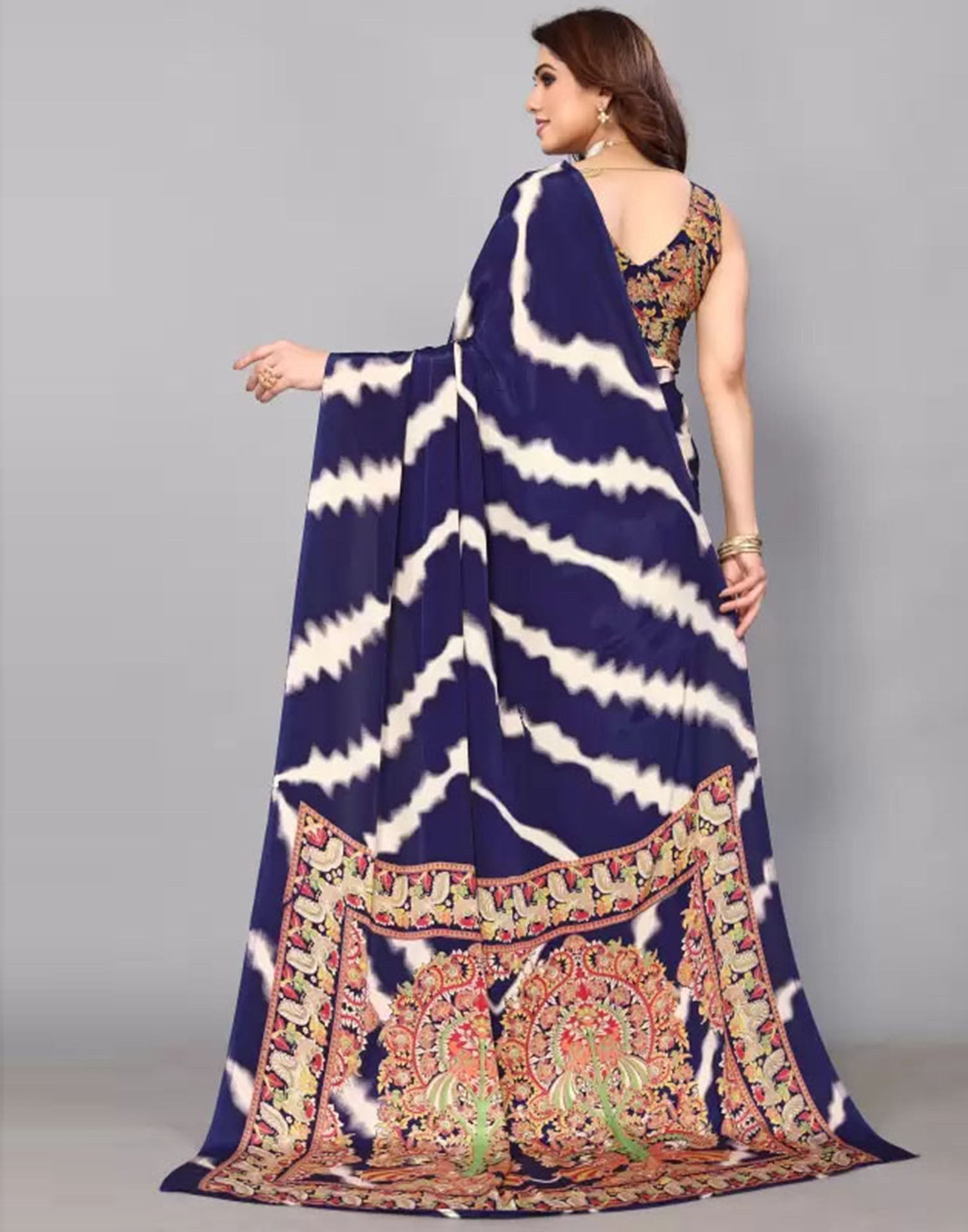 Navy Blue Chiffon Printed Saree