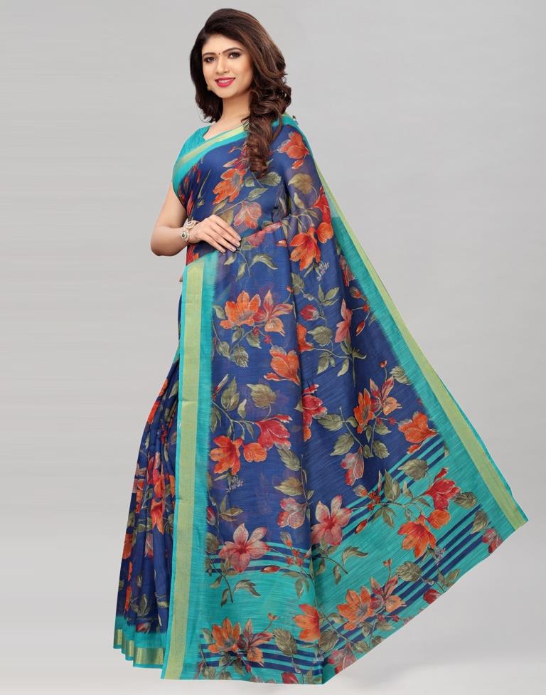 Navy Blue Printed Silk Saree
