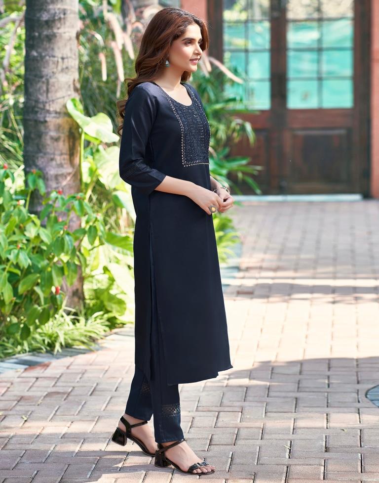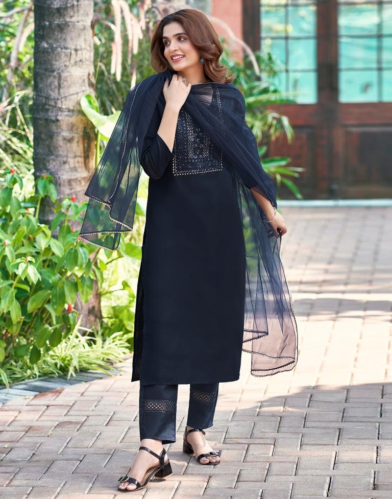 Nvay Blue Plain Cotton Straight Kurta Set With Dupatta