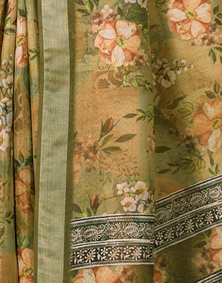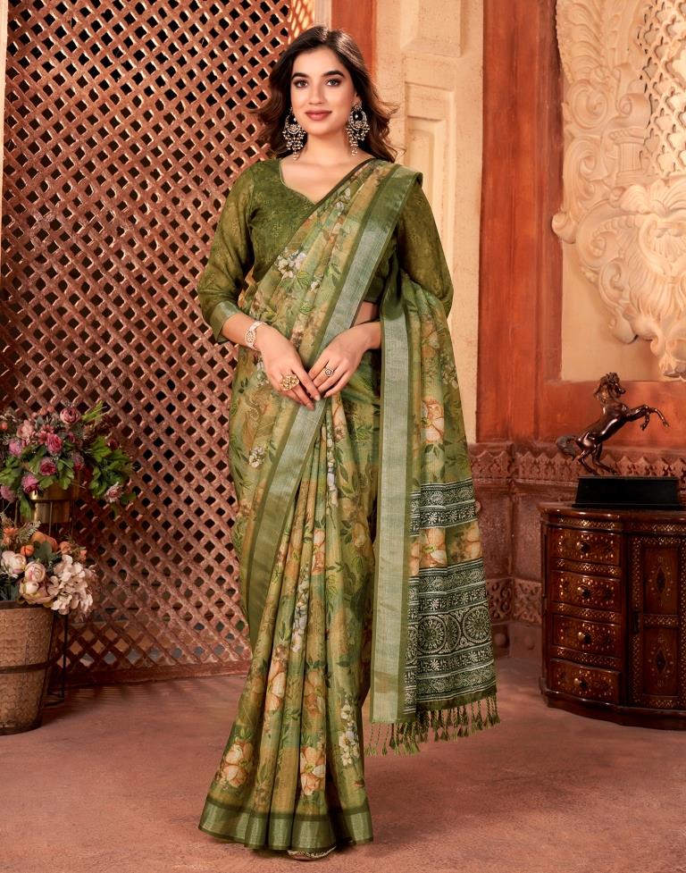 Olive Green Linen Printed Saree