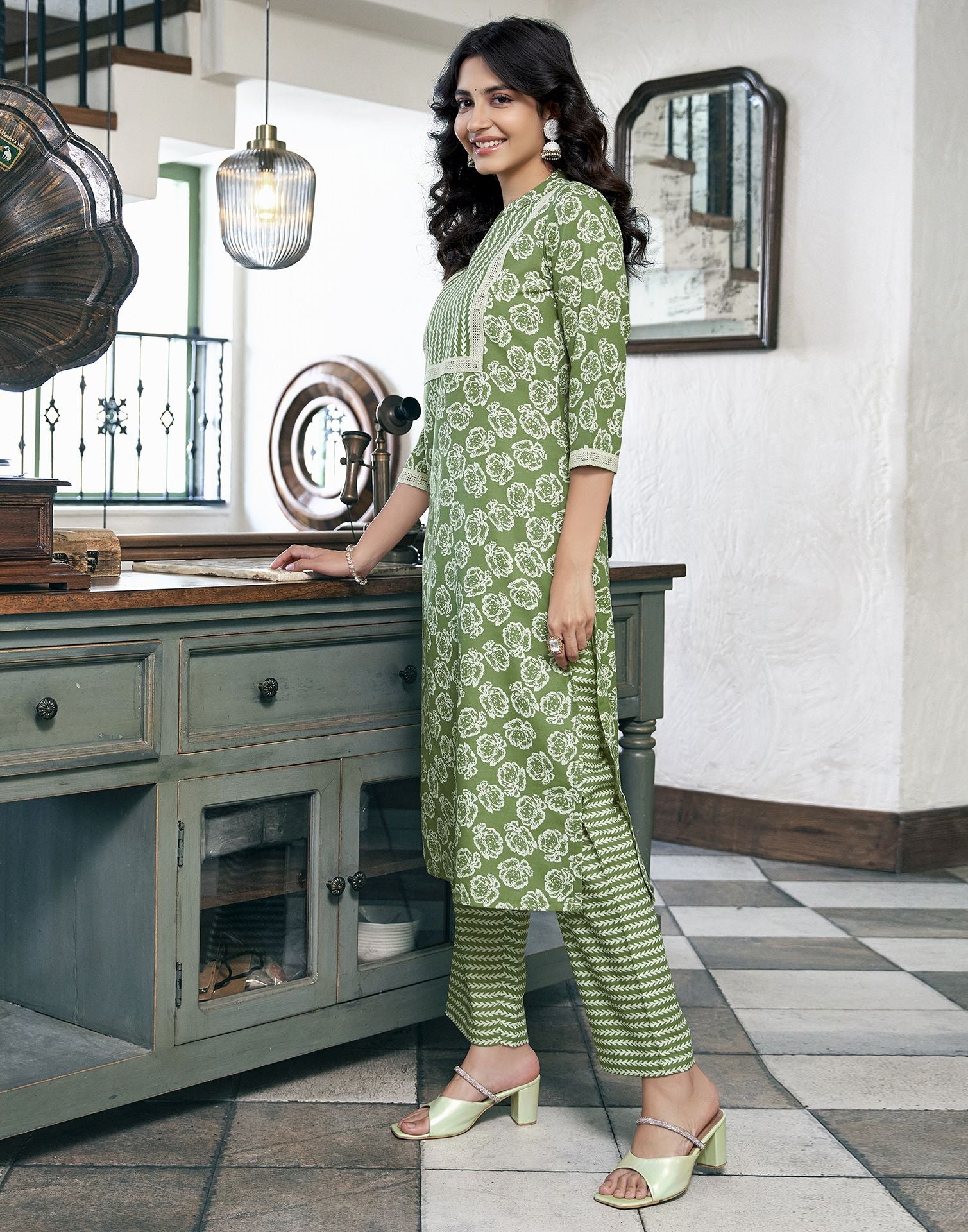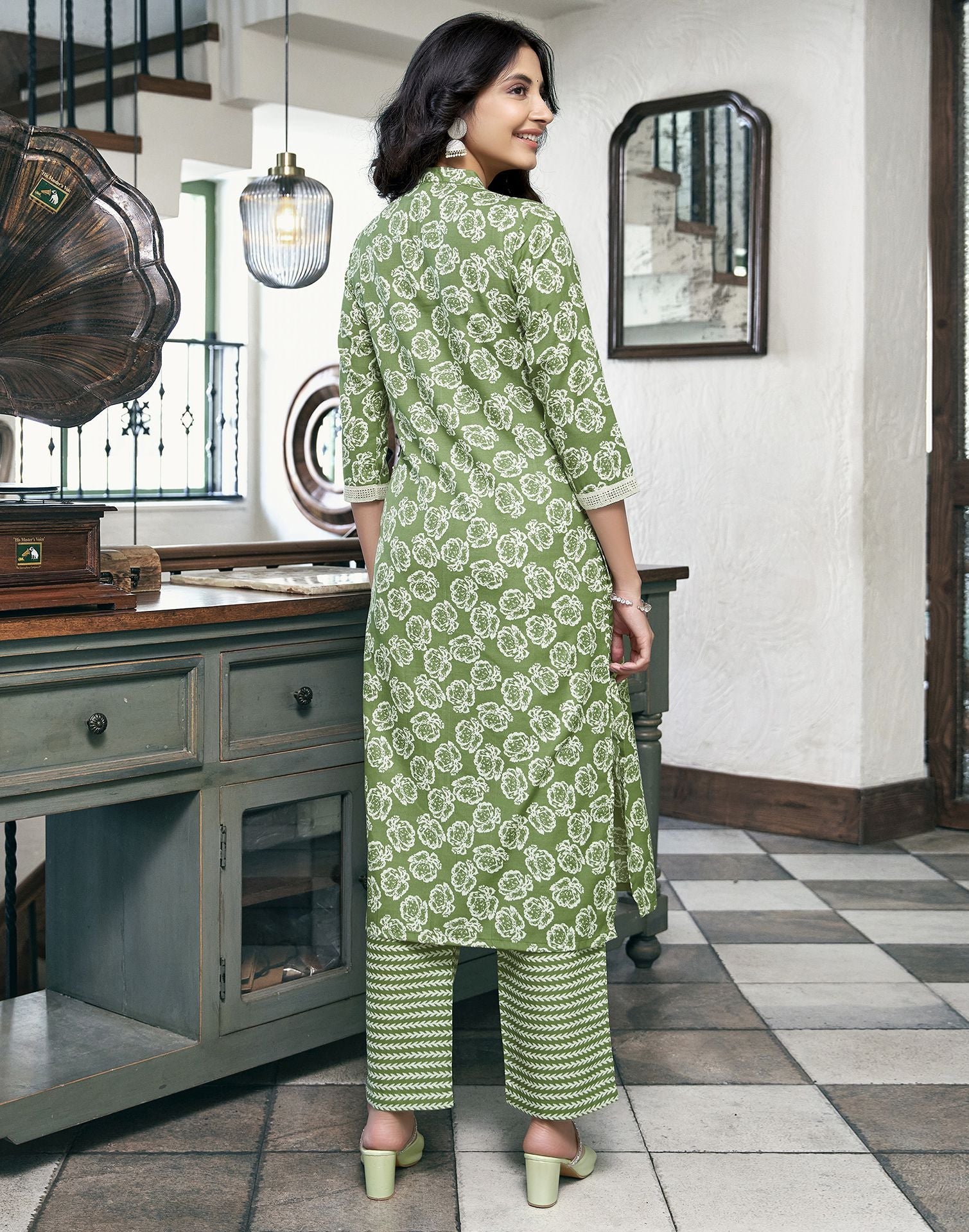 Pista Green Printed Cotton Straight Kurta Set With Dupatta