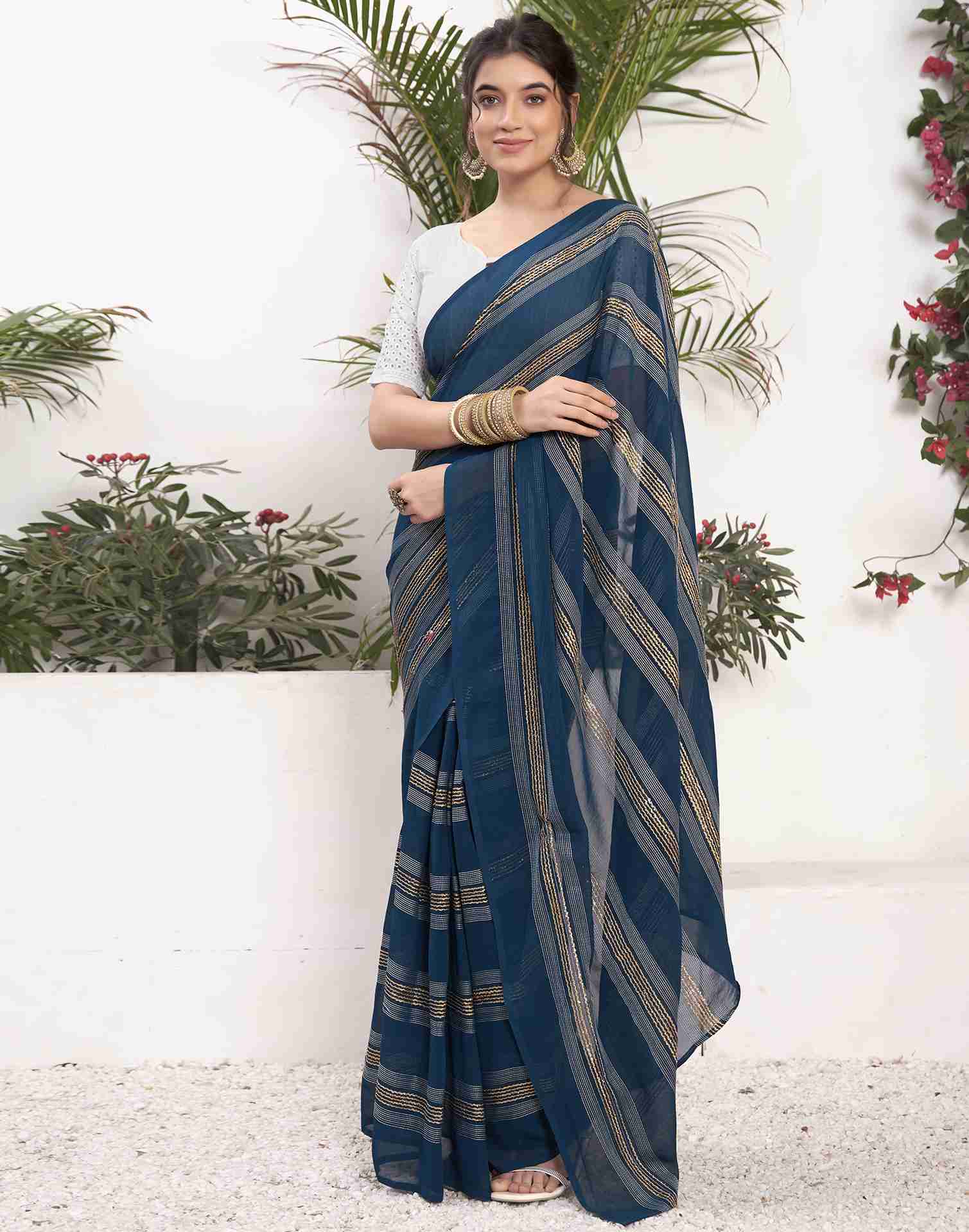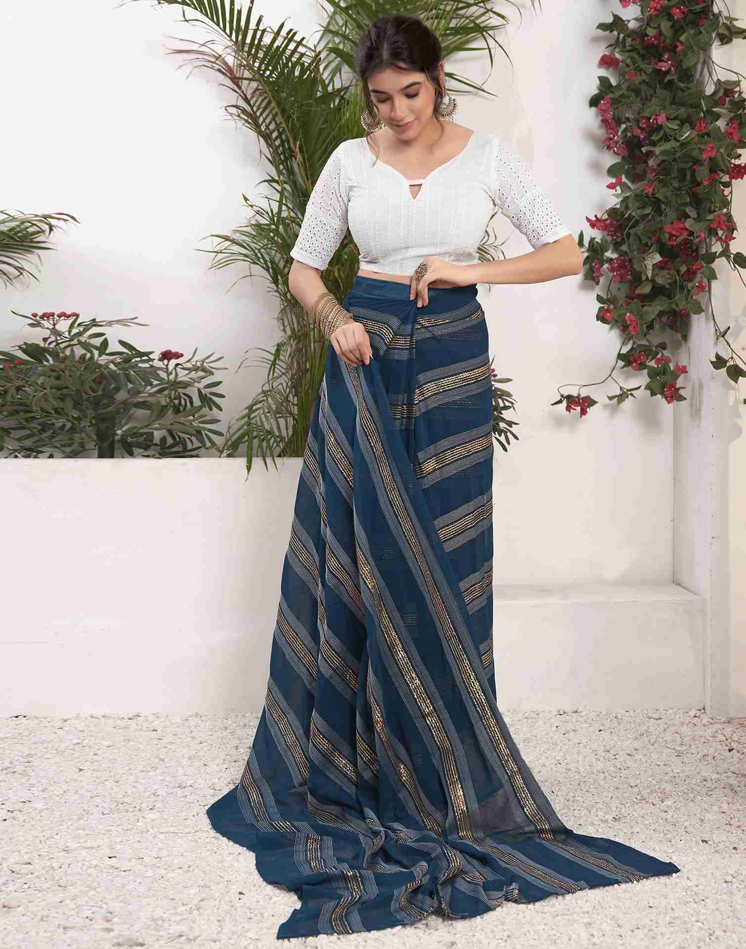 Ready To Wear Sea Blue Georgette Plain Printed Saree