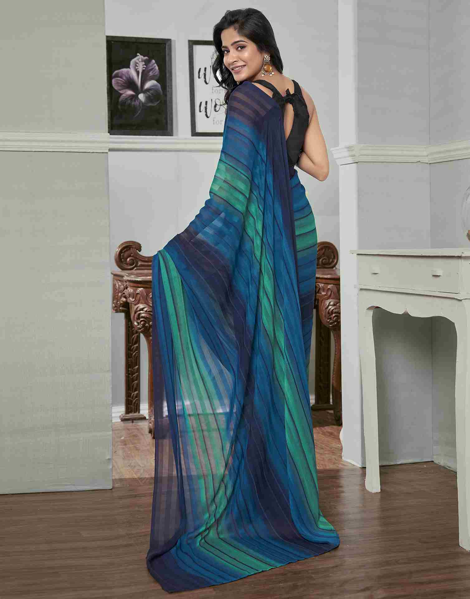 Ready To Wear Navy Blue Georgette Printed Plain Saree