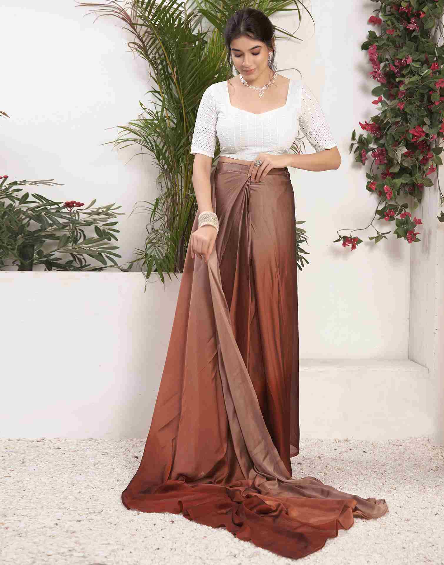 Ready To Wear Chestnut Brown Georgette Plain Saree
