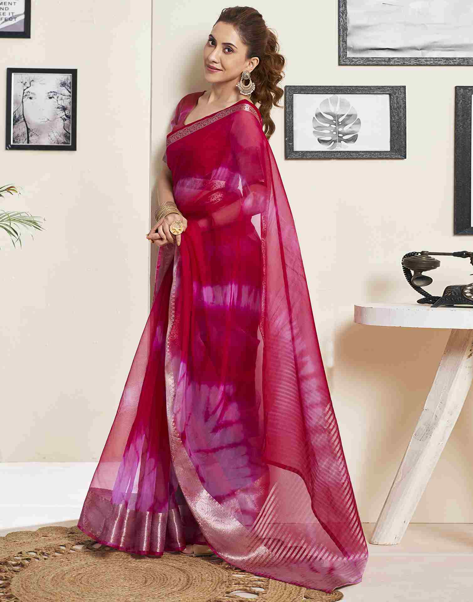 Red Organza Printed Woven Saree