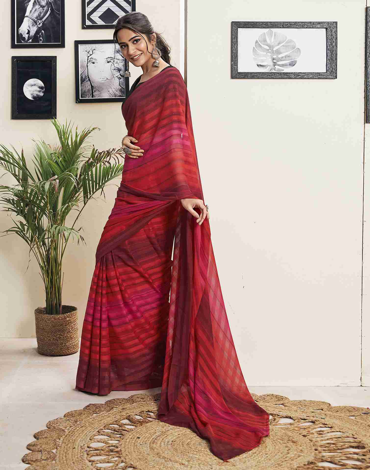 Ready To Wear Maroon Georgette Printed Plain Saree