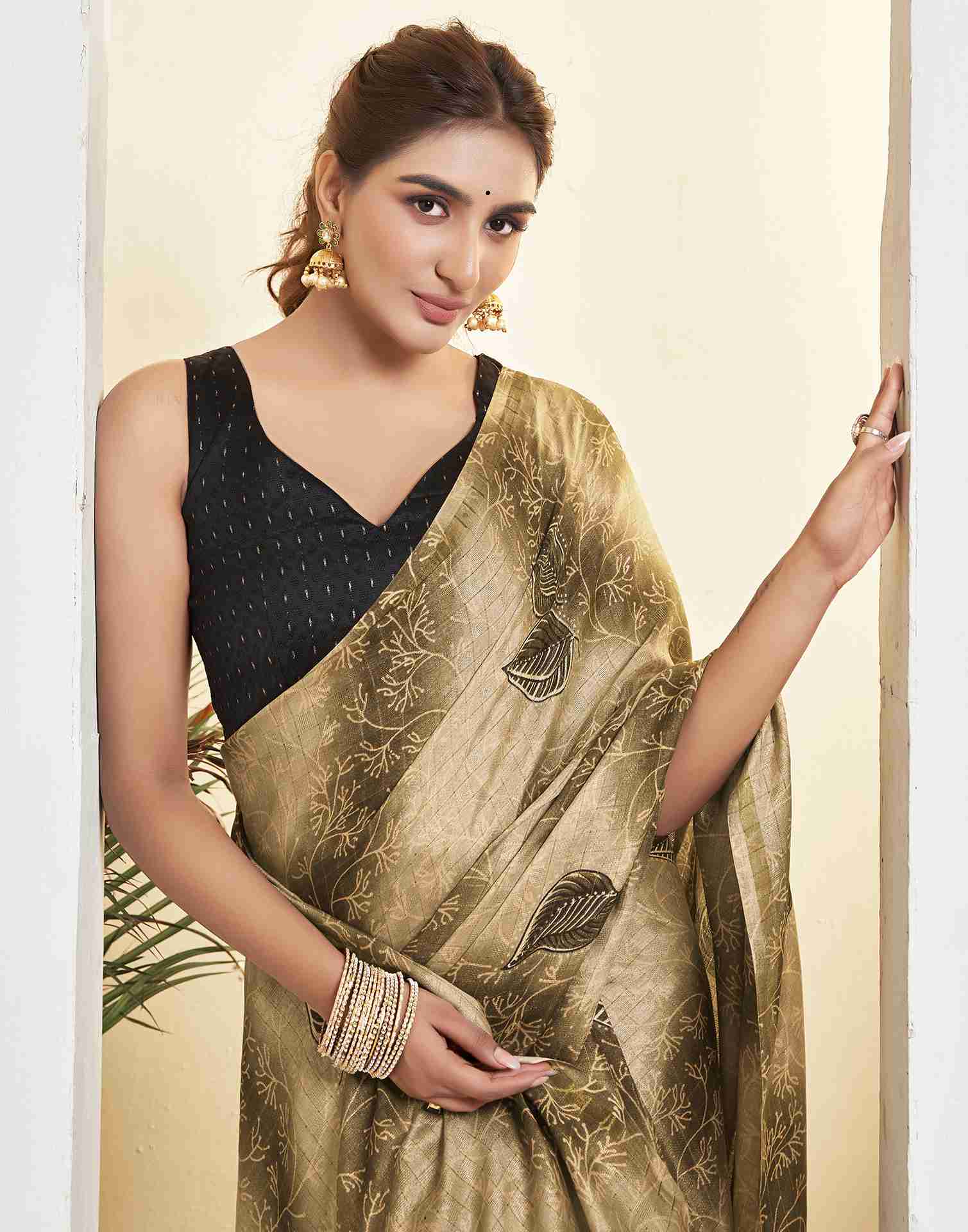 Ready To Wear Khaki Silk Printed Saree