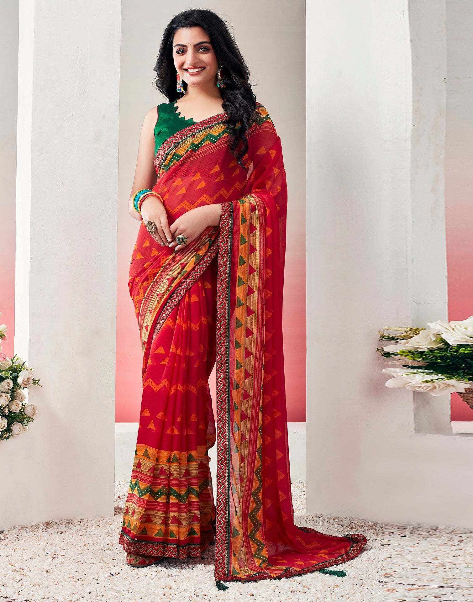 Red Chiffon Printed Saree