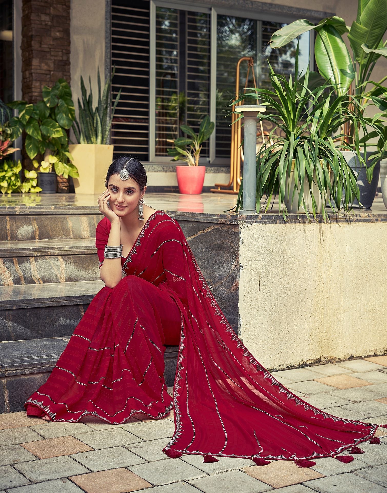 Red Plain Georgette Saree